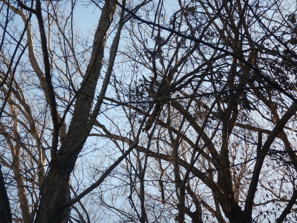 大型台風の被害で折れ樹上に引っ掛かったままの枝や、ナラ枯れの被害により枯損した高木。